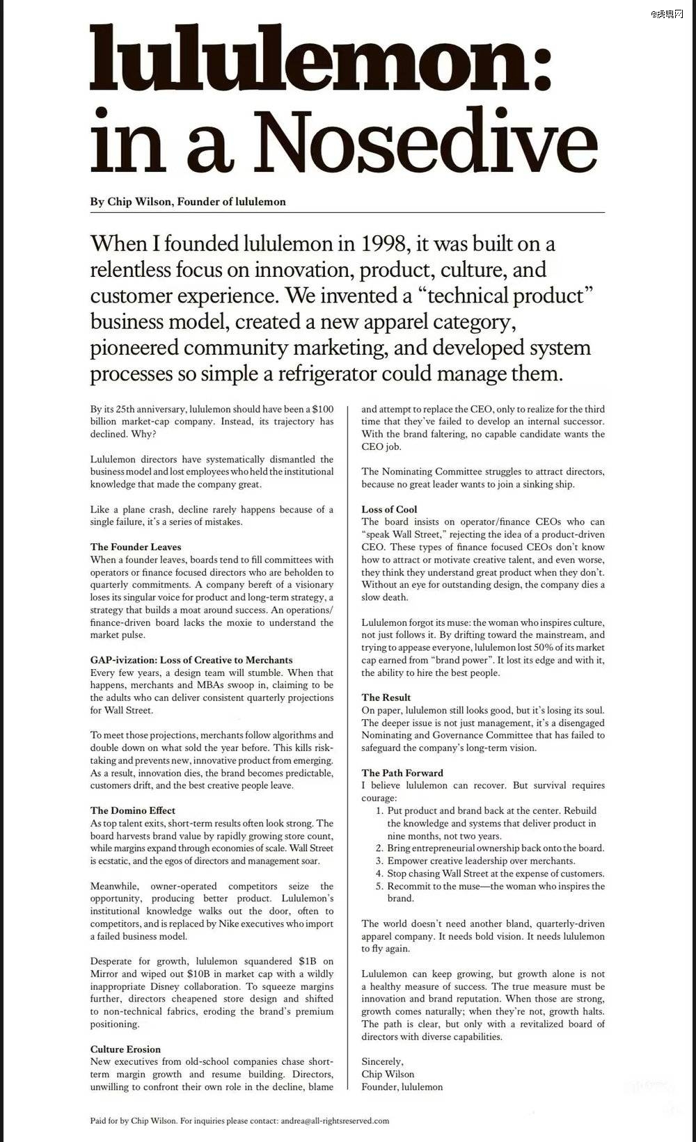 这是lululemon创始人Chip Wilson近日自费在《华尔街日报》买下整版广告,发表的一封致全体董事会的公开信,开篇就是灵魂暴击,拷问lululemon作为一家明星公司已在失速,问题究竟出在哪里。